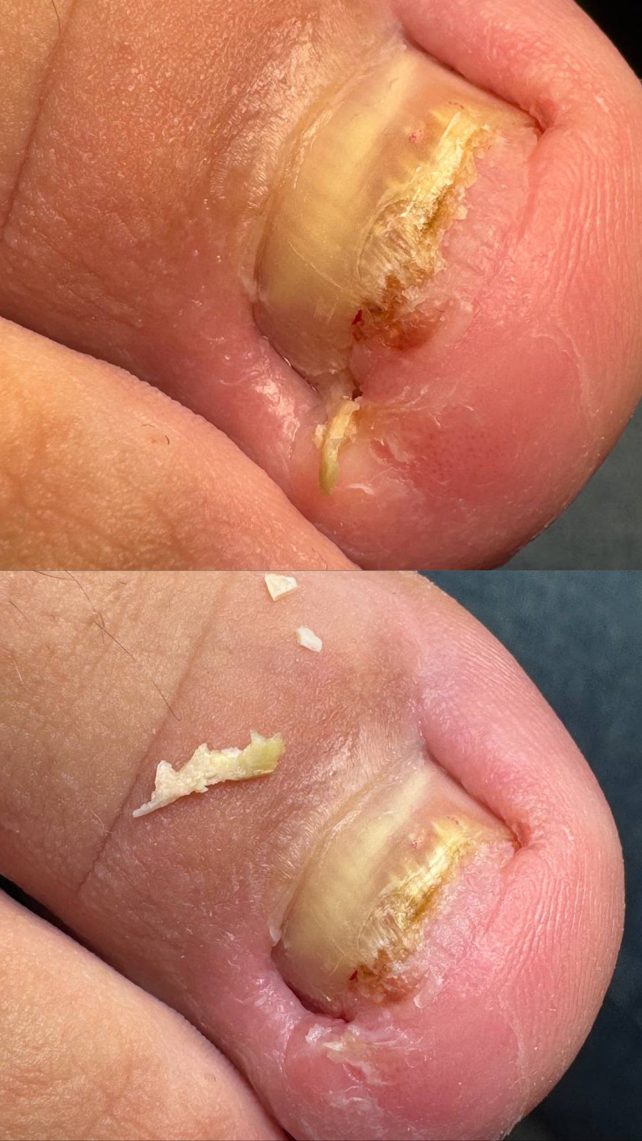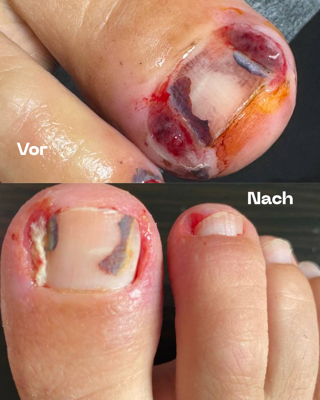 Unsere Podologin entfernt die Druckstellen, entlastet den Nagel und verhindert ein erneutes Einwachsen.